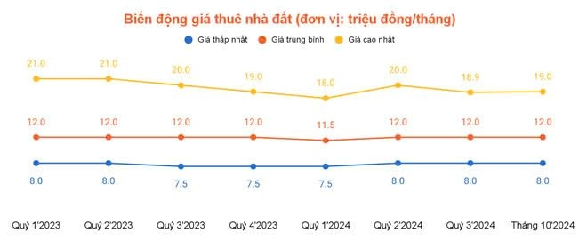 Giá thuê nhà đất: Ghi nhận sự gia tăng ở mức thấp nhất và trung bình. Cụ thể, giá thấp nhất tăng từ 7,5 triệu đồng/tháng trong quý 1 lên 8 triệu đồng/tháng từ quý 2 và duy trì ổn định đến tháng 10. Giá trung bình đạt 12 triệu đồng/tháng trong suốt ba quý, không thay đổi so với cùng kỳ năm trước. Trong khi đó, giá cao nhất dao động từ 18 triệu đồng/tháng trong quý 1, tăng lên 20 triệu đồng/tháng vào quý 2, sau đó giảm xuống 18,9 triệu đồng/tháng ở quý 3 và tăng nhẹ lên 19 triệu đồng/tháng vào tháng 10.